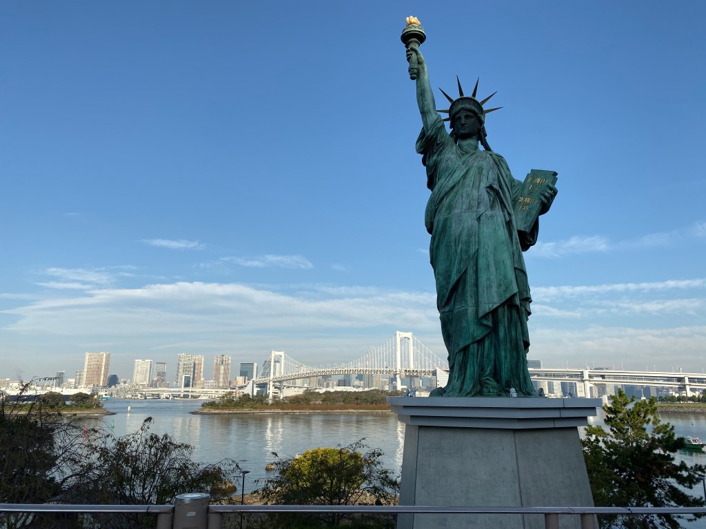 Pernahkah anda mendengar atau melihat keberadaan sebuah replika patung liberty di Jepang. Replika patung liberty tersebut berada di kawasan Odaiba-Tokyo. Selain dapat melihat replika patung liberty, di Odaiba pengunjung juga dapat bersantai di bangku-bangku disebuah taman sambil menyaksikan keindahan rainbow bridge, bangunan kantor pusat telivisi NHK, dan properti lainnya.