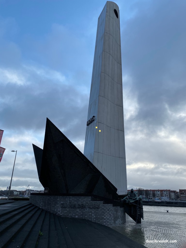 Near the Erasmus Bridge there is a monument, the De Boeg National Maritime Trader Monument. Design for the National Merchant Navy Monument in 1953 De Boeg is a command of war in Rotterdam. It commemorates 3,500 people aboard a Dutch merchant ship who lost his life in World War II. Fred Carasso Monument was inaugurated on April 10, 1957 by Princess Margriet in the corner of Boompjes and Leuvehaven. The 46 meter high aluminum construction symbolizes the arc in a concrete wave. Then, on July 15, 1965, a group of 8 meters high bronze statues was added to the monument: a helmsman, three sailors and a strong man. Next to it is the text: “They keep going” (sources: nl.wikipedia. org)