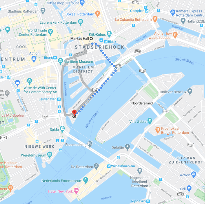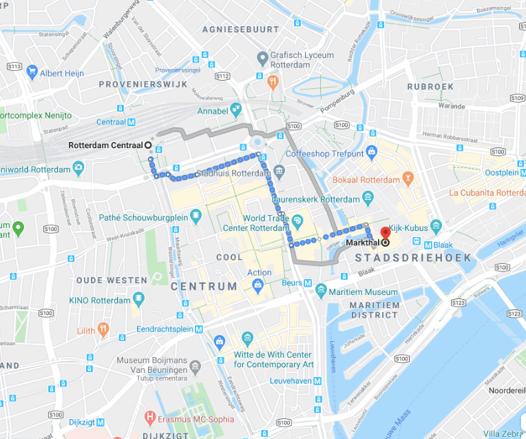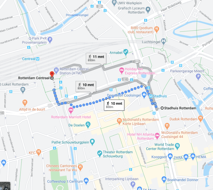Because the route to the Markthal crosses the Rotterdam Stadhuis, I suggest you to visit the Markthal after visiting the Stadhuis. The distance from Rotterdam Stadhuis to the markthal is around 800 meters which takes about 10 minutes by walk.